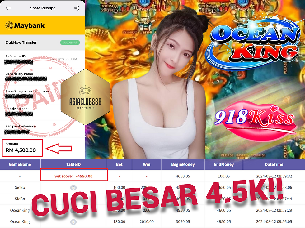KISS OCEANKING CUCI BESAR BESAR RM4500!!!! TAHNIAH CUCI BESAR BESAR. Terima kasih kerana selalu support kami di sini AsiaClub88. TAHNIAH boleh cuci sebanyak RM4500.00 🤭 Harap member member lain kami juga akan kuat cuci😍Banyak ONG ONG!!