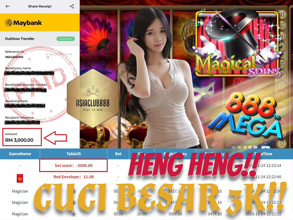 MEGA MAGICIAN CUCI BESAR BESAR RM3000!!!! TAHNIAH CUCI BESAR BESAR. Terima kasih kerana selalu support kami di sini AsiaClub88. TAHNIAH boleh cuci sebanyak RM3000.00 🤭 Harap member member lain kami juga akan kuat cuci😍Banyak ONG ONG!!